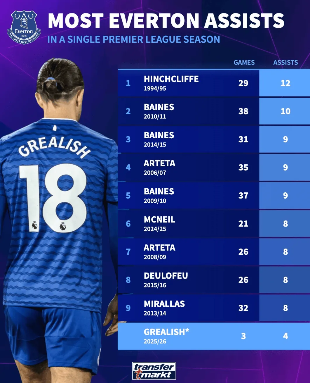 刚荣膺英超8月最佳球员的格拉利什在3场比赛中完成4次助攻,很有机会打破队史单赛季助攻王纪录。